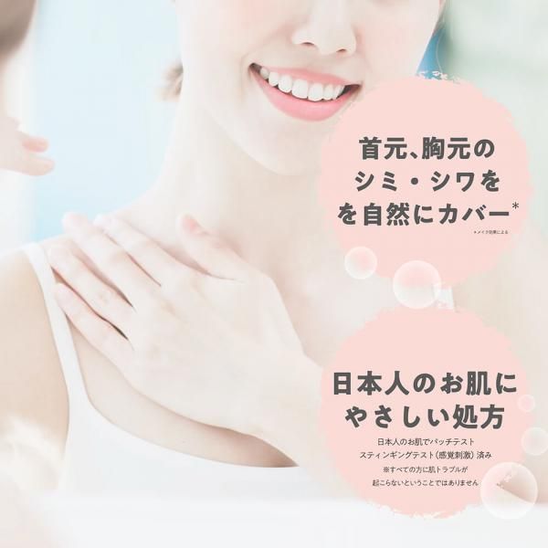 塗ってすぐサラサラな使用感!!ソフトフォーカス効果で気になる首元〜デコルテラインを自然にカバー。ツヤとうるおいに満ちた首元へ導く。