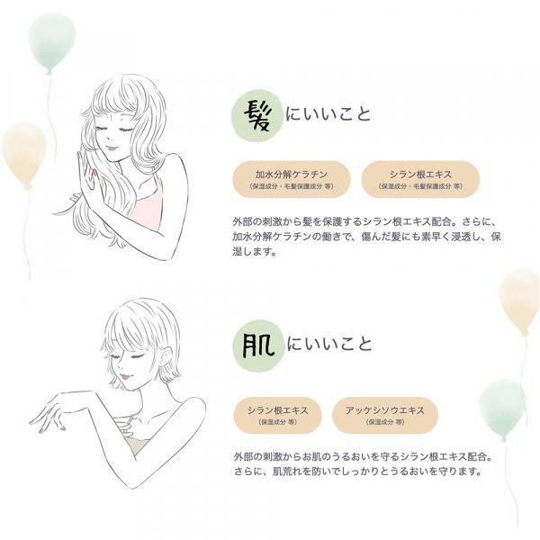 傷んだ髪にも素早く浸透し、うるおいを守ります。ドライヤーの熱から髪を守る働きもあるため、寝癖直しにぴったりです。