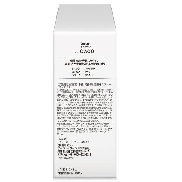 変性アルコール、水、香料、テトラメチルアセチルオクタヒドロナフタレンズ、リナロール、リモネン、レモン果皮油、酢酸リナリル、ピネン、ベルガモット果皮油、シトラール、クマリン、シトロネロール、酢酸ゲラニル、テルピネオール、ゲラニオール
