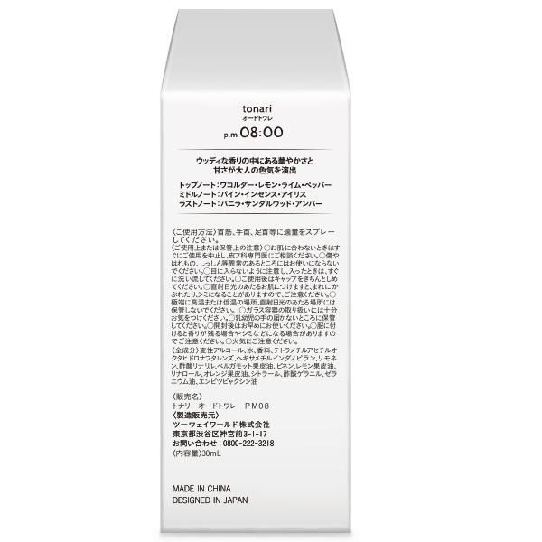 変性アルコール、水、香料、テトラメチルアセチルオクタヒドロナフタレンズ、ヘキサメチルインダノピラン、リモネン、酢酸リナリル、ベルガモット果皮油、ピネン、レモン果皮油、リナロール、オレンジ果皮油、シトラール、酢酸ゲラニル、ゼラニウム油、エンピツビャクシン油