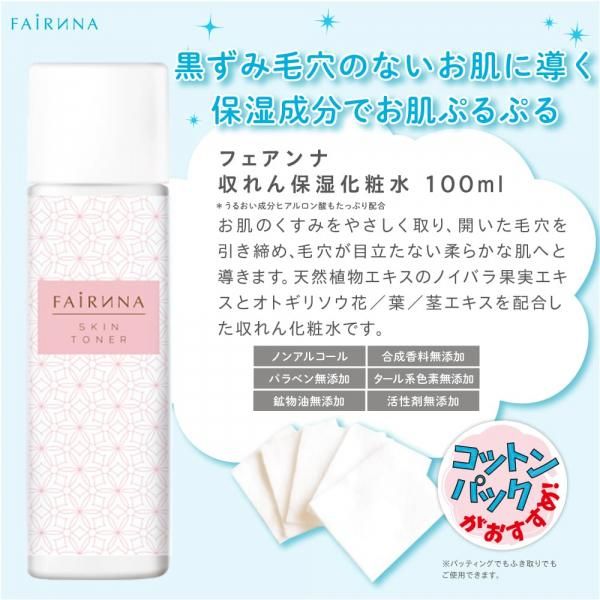 保湿成分として天然植物エキスのノイバラ果実エキスとオトギリソウ花を配合したやさしい使い心地の収れん化粧水です。ヒアルロン酸(保湿成分)も配合しているのでご使用後もお肌がしっとりうるおいます。