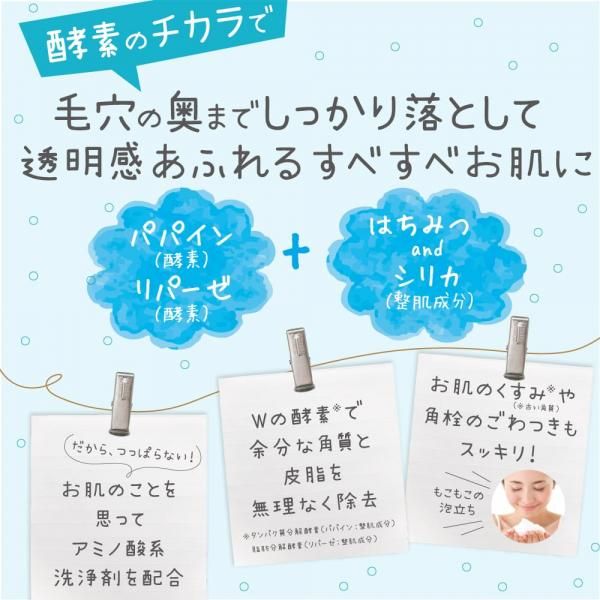 黒ずみ・角栓・古い角質をしっかり落とす、パウダータイプの洗顔料。皮脂を除去してお肌の汚れをしっかりと落とす2種の酵素(タンパク質分解酵素・脂肪分解酵素)を配合しております。もこもこな泡立ちでお肌の汚れをとりのぞき、しっとりとなめらかに洗い上げます。アミノ酸系洗浄剤と石鹸成分を組み合わせたやさしい使い心地の洗顔料です。