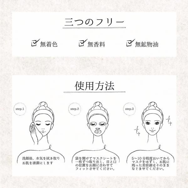 ●傷やはれもの・湿疹等、異常のある部位にはお使いにならないでください。●お肌に異常が生じてないかよく注意してください。●化粧品がお肌に合わない時、即ち次のような場合は使用を中止してください。そのまま使用を続けますと、症状を悪化させることがありますので、皮膚科専門医等にご相談されることをおすすめします。1. 使用中、赤み・はれ・かゆみ・刺激・色ぬけ(白斑等)や黒ずみ等の異常があらわれた場合 2. 使用したお肌に、直射日光があたって上記のような異常があらわれた場合●一度お使いになったマスクは衛生上、繰り返してお使いにならないでください。また、一度取り出したマスクは袋に戻さないでください。●エッセンスが目に入らないよう注意してください。もし目に入った時はすぐに洗い流してください。