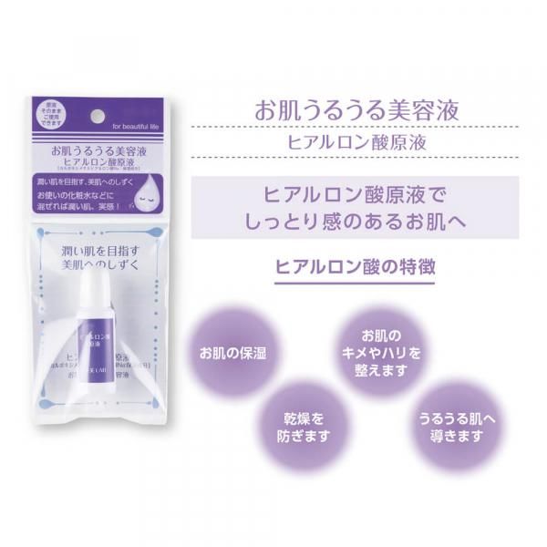 乾燥を防いでお肌のキメやハリを整える、ヒアルロン酸の原液です。使用しているのは、従来のヒアルロン酸と比べて3倍の水分保持力と2倍の水和力(水分と結合する作用)を持つ「カルボキシメチルヒアルロン酸Na」(保湿成分)です。