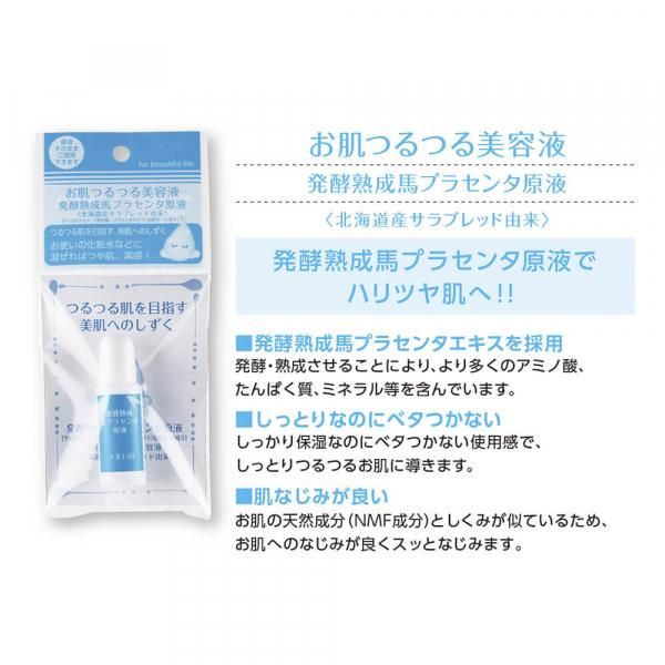つるつる肌を目指すプラセンタ原液です。発酵熟成馬プラセンタエキス(サッカロミセス/(黒砂糖/プラセンタエキス)発酵液[保湿成分])で、しっかり保湿するのにベタつかず、しっとりつるつる肌に導きます。※「発酵熟成馬プラセンタ」は通常のプラセンタと違い、プラセンタを酵母菌により3ヶ月間をかけて、じっくり発酵と熟成させています。