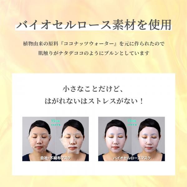 【バイオセルロースマスク】とは、ココナッツウォーターを元に作られた髪の毛の約1,000分の1程度の細さの繊維を採用したプルプルのマスクです。