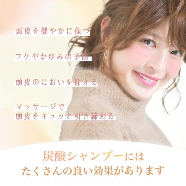 炭酸シャンプーには、「血行促進」「汚れを浮かせる」2つの効果があります。地肌(頭皮)の血行を改善し、毛穴に詰まった落ちにくい汚れをスッキリさせます。さらに、洗いながら地肌(頭皮)をマッサージすることで、顔の血行も良くなりフェイスリフトアップの効果も♪