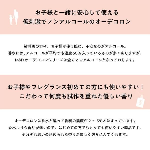 お子様と一緒に使う際に、不安なのがアルコール。フレグランス(香水)には、アルコールが平均でも濃度60%入っているものが多くありますが、このコロンはノンアルコールとなっております。