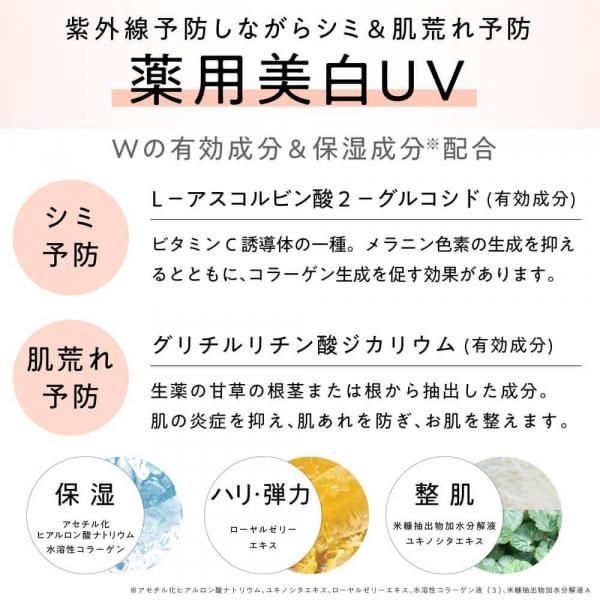 【その他成分】精製水、メチルポリシロキサン、低温焼成酸化亜鉛、メチルハイドロジェンポリシロキサン、微粒子酸化チタン、含水ケイ酸、水酸化アルミニウム、ポリオキシエチレン・メチルポリシロキサン共重合体、トリ2−エチルヘキサン酸グリセリル、メチルフェニルポリシロキサン、1,2−ペンタンジオール、1,3−ブチレングリコール、ジグリセリン、リンゴ酸ジイソステアリル、架橋型メチルポリシロキサン、塩化ナトリウム、セスキイソステアリン酸ソルビタン、セスキオレイン酸ソルビタン、トリメチルシロキシケイ酸、クエン酸ナトリウム、アセチル化ヒアルロン酸ナトリウム、ユキノシタエキス、ローヤルゼリーエキス、水溶性コラーゲン液(3)、米糠抽出物加水分解液A、ジペンタエリトリット脂肪酸エステル(1)、ジメチルジステアリルアンモニウムヘクトライト、クエン酸、水酸化カリウム、デカメチルシクロペンタシロキサン、香料