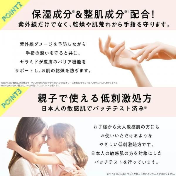 ・白浮きしにくくベタつかないUVハンドクリームで、手指を日焼けから守りながら肌荒れを防ぎます。