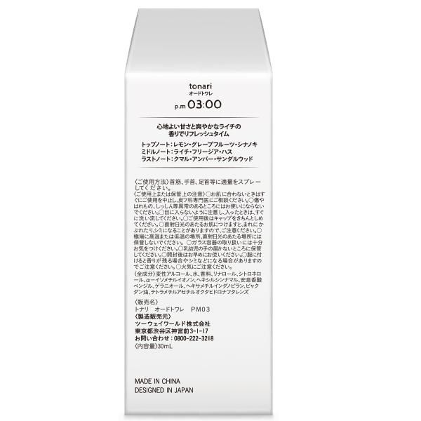 変性アルコール、水、香料、リナロール、シトロネロール、αーイソメチルイオノン、ヘキシルシンナマル、安息香酸ベンジル、ゲラニオール、ヘキサメチルインダノピラン、ビャクダン油、テトラメチルアセチルオクタヒドロナフタレンズ