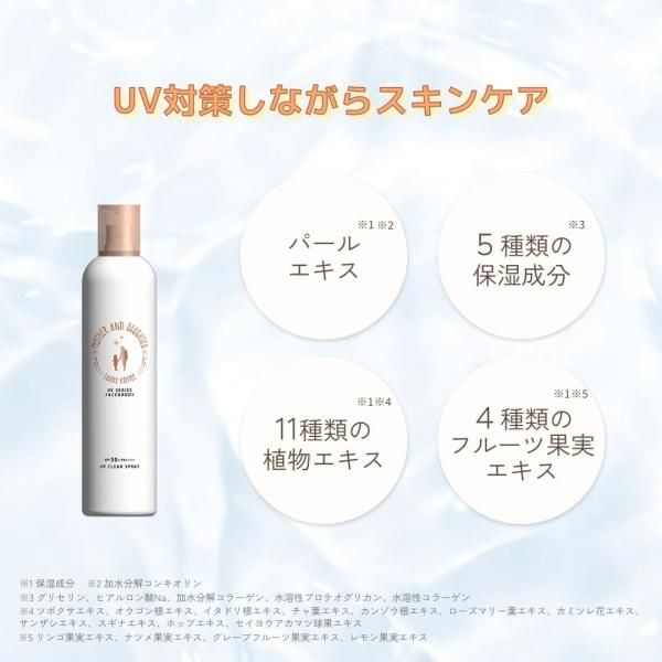 LPG、水、シクロペンタシロキサン、パルミチン酸エチルヘキシル、水添ポリイソブテン、メトキシケイヒ酸エチルヘキシル、ポリメチルシルセスキオキサン、ジエチルアミノヒドロキシベンゾイル安息香酸ヘキシル、BG、オクトクリレン、トリメチルシロキシケイ酸、オクテニルコハク酸デンプンAl、PEG−10ジメチコン、ビスエチルヘキシルオキシフェノールメトキシフェニルトリアジン、PEG/PPG−19/19ジメチコン、ジステアルジモニウムヘクトライト、テトラヘキシルデカン酸アスコルビル、リン酸アスコルビルMg、α−グルカン、グリセリン、グルコシルセラミド、シアノコバラミン、オレイン酸ポリグリセリル−10、ヒアルロン酸Na、加水分解コラーゲン、加水分解コンキオリン、水溶性プロテオグリカン、水溶性コラーゲン、ツボクサエキス、コメヌカ油、ライム果汁、オウゴン根エキス、イタドリ根エキス、オレンジ果汁、チャ葉エキス、カンゾウ根エキス、レモン果汁、ローズマリー葉エキス、カミツレ花エキス、リンゴ果実エキス、ナツメ果実エキス、グレープフルーツ果実エキス、サンザシエキス、レモン果実エキス、スギナエキス、ホップエキス、セイヨウアカマツ球果エキス、フェノキシエタノール、香料