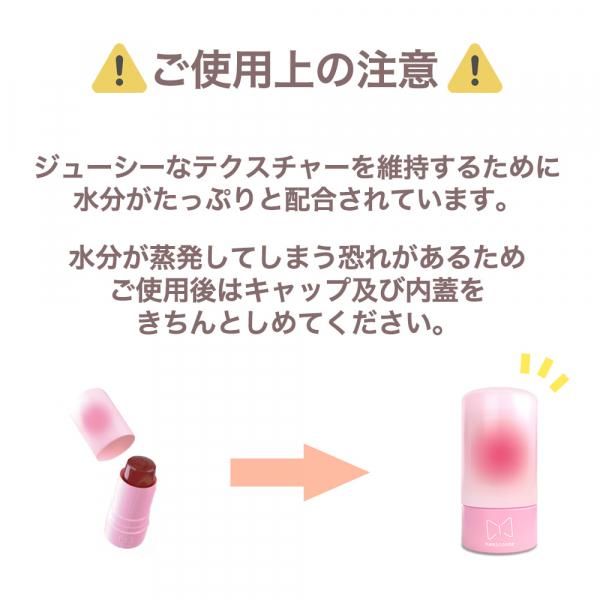 ●頬・唇に合わない時、また、傷、湿疹等、異常のある時は使用しないでください。●お肌に異常が生じていないかよく注意して使用してください。お肌に合わない時、即ち次のような場合には使用を中止してください。そのまま使用を続けますと、症状を悪化させる恐れがありますので皮フ科専門医等にご相談されることをおすすめします。(1)使用中に赤み、はれ、かゆみ、刺激、色抜け(白斑等)の異常があらわれた場合。(2)使用したお肌に、直射日光があたって(1)のような異常があらわれた場合。●極端に高温または低温の場所、直射日光のあたる場所には保管しないでください。●乳幼児の手の届かないところに保管してください。●ティントは出しすぎると折れることがあります。1~2mmほど繰り出してお使いください。●強く擦ると崩れてしまう恐れがあるため、ご注意ください。●ご使用後はキャップ及び内蓋をきちんとしめてください。●キャップ及び内蓋をしめないで保管されますと、水分が蒸発してしまう恐れがございますのでご注意ください。●ジューシーなテクスチャーを維持するためにたっぷり配合された水分がにじみ出る事がありますが、品質には問題ございません。●ケース等にティントカラーの水滴が付着した場合は、必要に応じ拭き取ってご使用ください。(衣服等に付かないようご注意ください。)